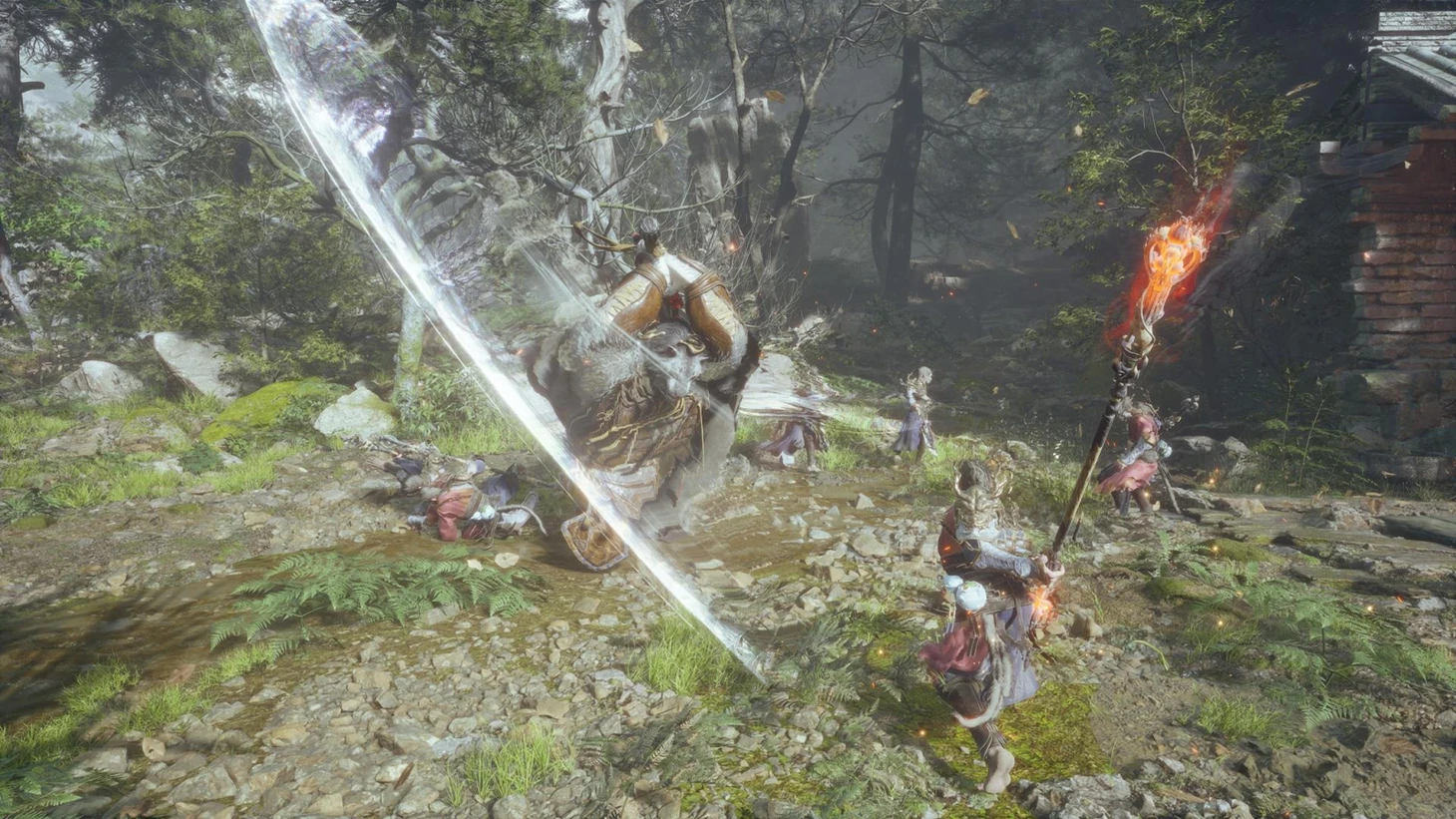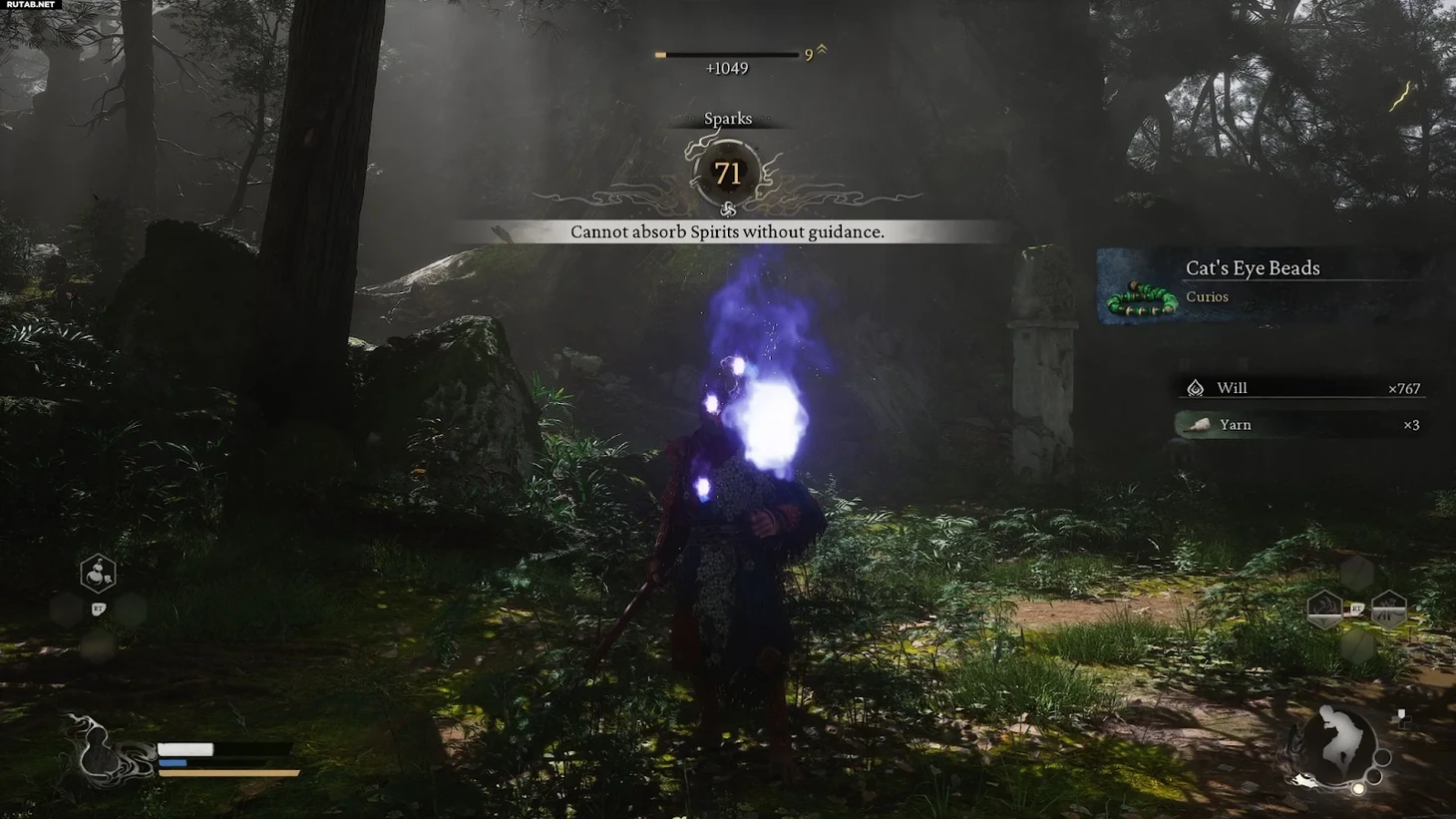 Этот ключевой предмет можно заработать, взаимодействуя с каменной головой статуи в конце ручья. Его предназначение пока неизвестно, но он может сыграть важную роль в дальнейшем прохождении. Получение первого уровня: После победы над несколькими противниками игрок получит свой первый уровень и «Искру» – очки навыков, которые можно вложить в различные деревья навыков. Далее игроку нужно обратиться к Древу навыков. Оно позволяет улучшать общие навыки или навыки, связанные с определенными боевыми стойками. Игрок начинает с разблокированной стойкой Smash, но может разблокировать и другие стойки, вкладывая очки навыков. В конце лесной дороги этой локации игрока ждет встреча с первым мини-боссом – вождем яогуай.