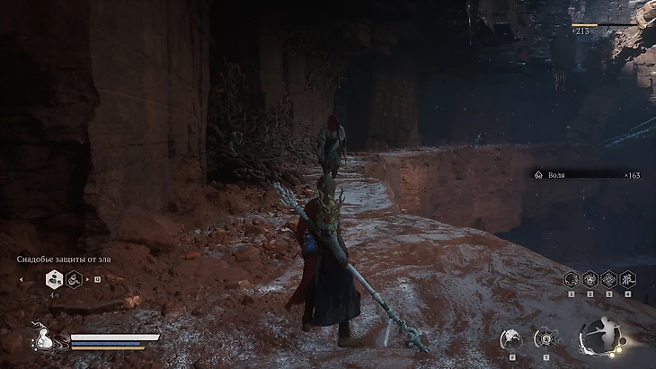 Пройдите мимо лестницы, отыщите Грибы-Змееголовы для сбора. Взгляните налево через открытую решетку камеры и заметьте Монаха-Клинка. Его можно столкнуть вниз Колющей атакой.