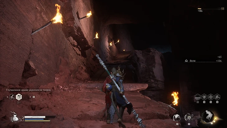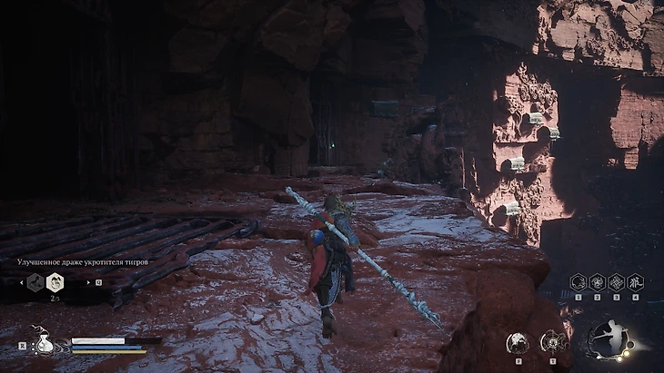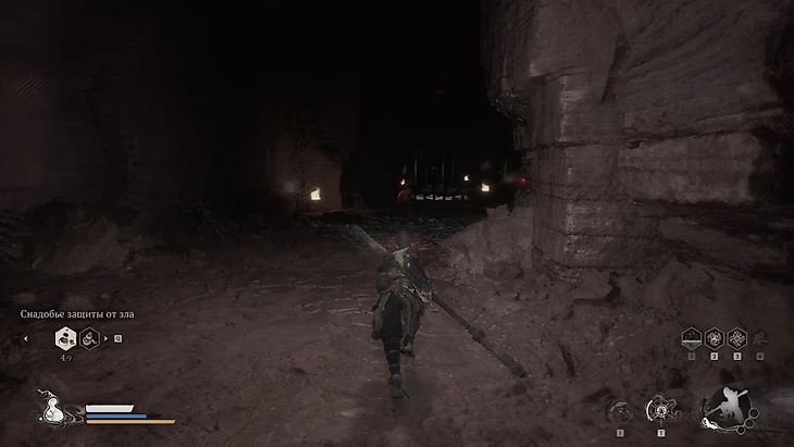 Медленно продвигайтесь по затемненному коридору, будьте готовы к засадам Отродий, Иссохших Трупов и Бирюзовых Летучих Мышей на потолке. Вскоре после них вы столкнетесь с Порабощенным Якшей. Он орудует длинным мечом, способным рубить широкими дугами или совершать выпады на огромную дистанцию. Все его атаки очень медленные, и их легко спровоцировать для Непоколебимого отражения.