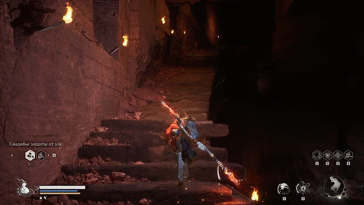 Поднимаясь по длинной лестнице на второй уровень, будьте готовы к тому, что Лучник Якша начнет обстреливать вас сверху. Отражайте его атаки, ловко вращая посохом.