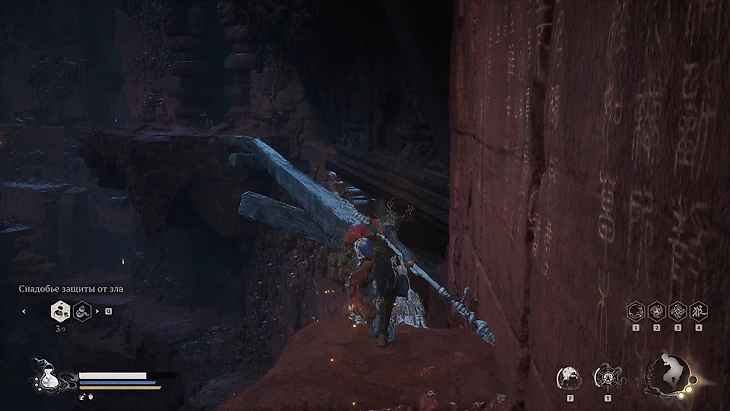 Затем вам предстоит пересечь тонкую деревянную балку, и, что еще хуже, на дальнем конце будет поджидать Лучник Якша. Не поддавайтесь искушению использовать мобильное Вращение Посохом во время движения, иначе вы автоматически качнетесь в сторону и сорветесь.