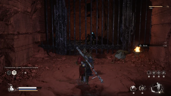 Уровень 2 – После подъема по лестнице идите по тропе направо и ищите первую дверь камеры справа, охраняемую Бирюзовой Летучей Мышью. Внутри вас поджидают Отродье в углу, а также усиленный Порабощенный Якша, после победы над которым вы получите его Дух. Не забудьте про сундук.