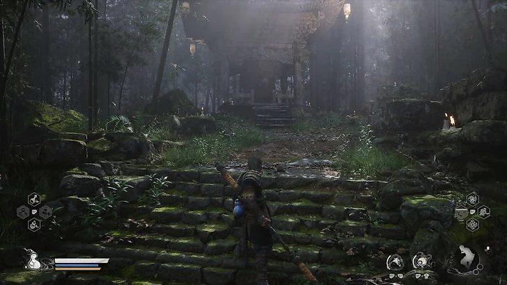 После общения с обезьяной Шэнь не забудьте осмотреть окрестности. Возле большой статуи, у деревянного выступа лесов, вы можете поглотить духа зеленого огонька и получить дополнительную Волю. Вы также можете спуститься ниже, чтобы сократить путь по главной тропе, но сначала стоит собрать еще один предмет. Выйдите из пещеры с обезьяной Шэнь и перейдите по деревянной платформе, где вы сражались со змеиным патрулем, на другую сторону. В небольшом здании на дальней стороне вы найдете большой сундук, содержащий 2 крошечных куска золота и 2 каменных духа. Эти ресурсы пригодятся вам для улучшения снаряжения и навыков.