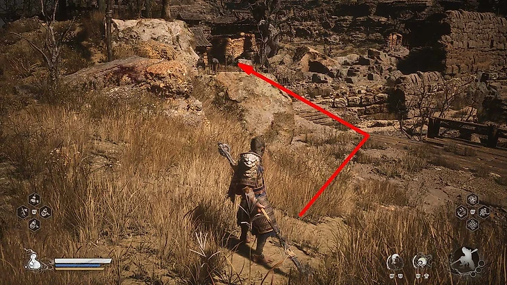 После победы над Крысиным Губернатором вы можете заметить большую жабу Яогуай в затопленной яме. Но пока лучше не вступать с ней в бой. Вместо этого вернитесь к месту, где встретили первого крысиного солдата, и найдите тропу, ведущую вверх, в холмы, огибающие яму. Поднимайтесь по тропе, проложенной среди деревянных лесов, возвышающихся над оврагом. Вскоре вы увидите поселение и первое святилище Хранителя, охраняемое еще одним Крысиным Солдатом.