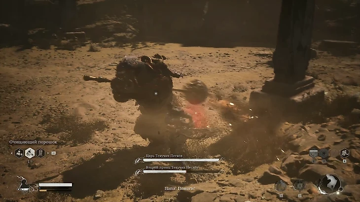 Ваш выбор в предыдущем бою с Королем Сыпучих Песков и его вторым сыном повлияет на ход этого сражения. Если вы пощадили короля, он призовет своего первого сына, чтобы тот сразился с вами. Если вы убили обоих, то можете использовать Острый Кусок Плоти, чтобы выманить принца из его логова. Первый Принц гораздо крупнее и сильнее своего младшего брата. Его атаки мощные и непредсказуемые. Используйте «Облачную поступь», чтобы уклоняться от его атак и контратаковать с флангов.