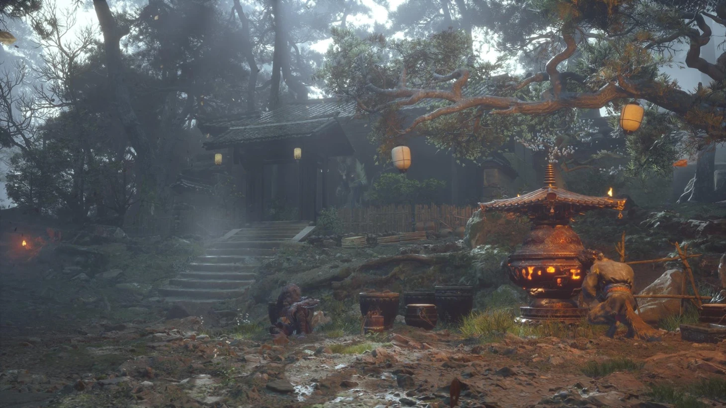 Пройдя через врата, охраняемые стражником, и поднявшись на вершину, можно найти место для медитации и получить Искру. Дальнейший путь лежит через проем между скалами слева, где находится алтарь, который необходимо активировать. После отдыха и знакомства с магазином игрока ждет встреча со старым знакомым – Обезьяной Шэнь, которая дарует способность временно превращаться в цикаду. Эта трансформация позволяет незаметно исследовать территорию впереди и избегать столкновений с врагами. Чтобы вернуться в облик обезьяны, достаточно зажать клавишу «4».