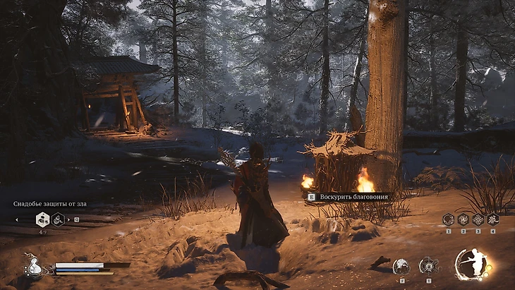 Прогуливаясь недалеко от Лесного Святилища, присмотритесь к небольшой арке вдоль основной тропы. Там вы обнаружите весьма примечательный труп, восседающий на деревянных столбах. Он явно выделяется на фоне остальных. Попробуйте взаимодействовать с ним, и вы услышите голос, доносящийся не от самого тела, а от лисьей шкуры на его шее. Похоже, история о снежной лисе и человеке, которую вы видели после прохождения второй главы, и впрямь имела место быть. Теперь лиса-гуай жаждет отмщения.
