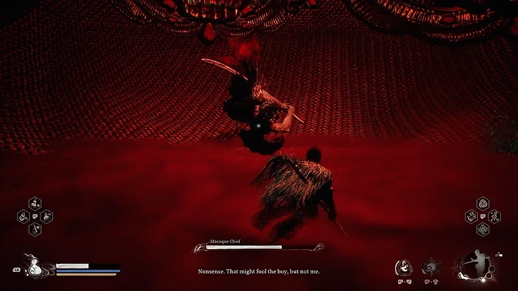 Бой с Вождем обезьян начинается с его стремительной атаки, в которой он резко опускает клинок, посылая в противника вакуумный режущий снаряд. Он также может бросить свой клинок, закрутившись вокруг своей оси и нанося два быстрых вращающихся удара. Завершает эту серию атак сальто назад с одновременным метательным ударом клинка. Дальше: