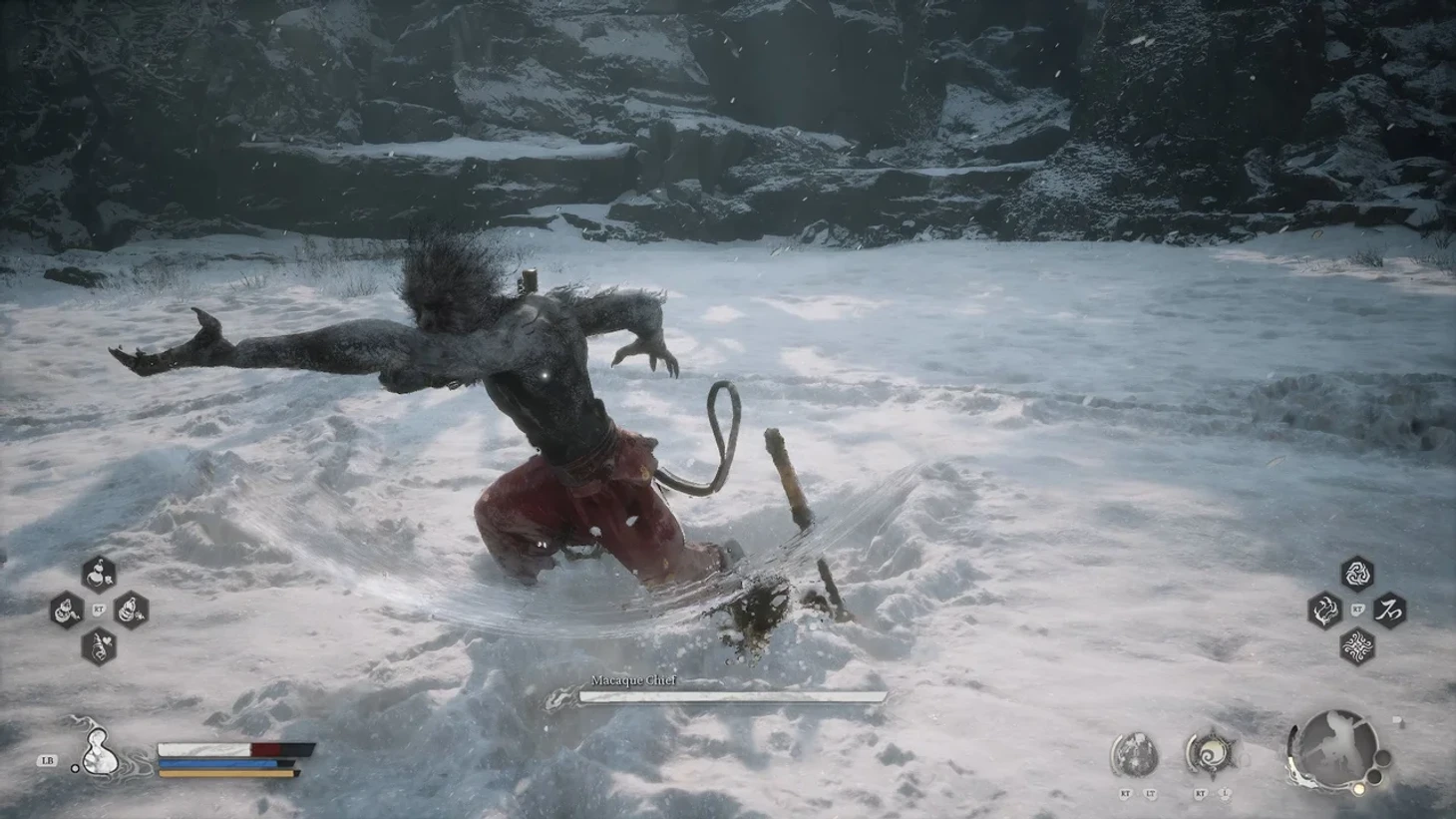 Еще одна опасная комбинация начинается с того, что Вождь обезьян хватает меч ногой и запрыгивает на его рукоять. Затем следует быстрый перекат по земле с вихревым ударом меча и финальный удар сверху вниз. Во время этой атаки важно не переусердствовать с собственными ударами, чтобы не обездвижить противника перед второй частью комбинации.