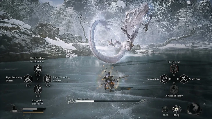 Бой часто начинается с того, что Канцзинь-лун бросается на вас головой вперед. Используйте Иммобилизацию, чтобы зафиксировать ее на месте и нанести несколько ударов. Когда он взлетит и зависнет перед вами, атакуйте голову, но будьте готовы к резкому развороту и новым атакам.