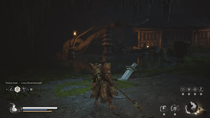 Обернитесь перед святилищем, найдете Фиолетовый Алтарь Талисманов, соберите второй талисман. За алтарем – дом с Сундуком, содержащим Кровь Железного Быка, и двумя Осами Гуай по бокам. Отдохните в святилище, идите в узкий проход.