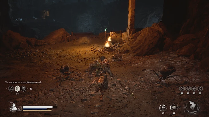 Приготовьтесь к группе Каменных Пауков, лучник на высокой скале усложнит жизнь, но можно добежать до деревянного пандуса за ним. Впереди зеленый Огонек вдоль левой стены, потом Святилище хранилища костей. Оба пути – этот и у Святилища Средней ямы – ведут к большой углубленной яме с кучей черепов в центре. Прыгайте в яму навстречу следующему серьезному противнику.