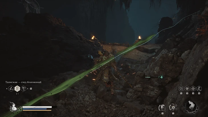 По левому пути найдете нишу с зеленым Огоньком и Фонарщика у входа в деревню. В деревне большое дерево с лианой, но охраняет его Скорпион-Принц. Этот враг с дополнительной духовной силой, сильнее первого из Верхней ямы. В деревне есть большие коконы с Пауками-Марионетками, отвлеките его от них, чтобы не сражаться с лишними врагами. Уклоняйтесь от ударов хвостом, отражайте атаки когтями, ждите момента для контратаки. Победив, получите Дух Скорпиона-Принца (и Замачивание Смертельного Жала), соберите Ароматную Лиану Луоцзя на дереве.