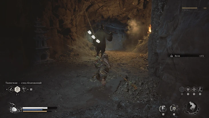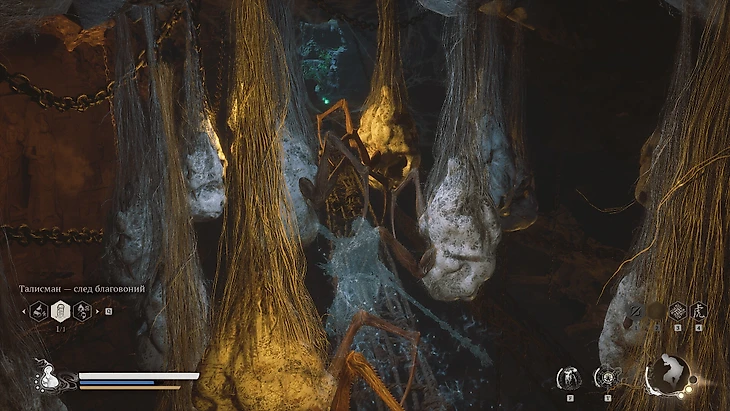 Во второй фазе, когда она ныряет в землю, не бейте по брюшку, взрыв яда трудно избежать. Взрыв имеет широкую область, используйте стойку Столба. Ее глаза засветятся, загипнотизируют вас в иллюзорное царство паутины. Там движение замедляется, делая вас беззащитным. Фаза длится 30 секунд, используйте на ней оцепенение или заклинание трансформации. После гипноза продолжайте уклоняться и атаковать после ее ударов. Когда босс падет, она отступит к реликвии мудреца. Следуйте за ней, избегая армии пауков. Бегите к выходу из пещеры, не останавливаясь. Вас спасет таинственная сестра-паук, перенеся над Паутиной ямой к Храму желтых цветов.