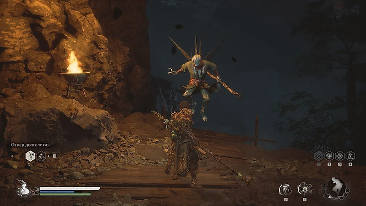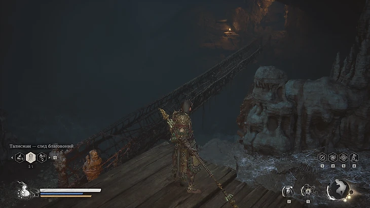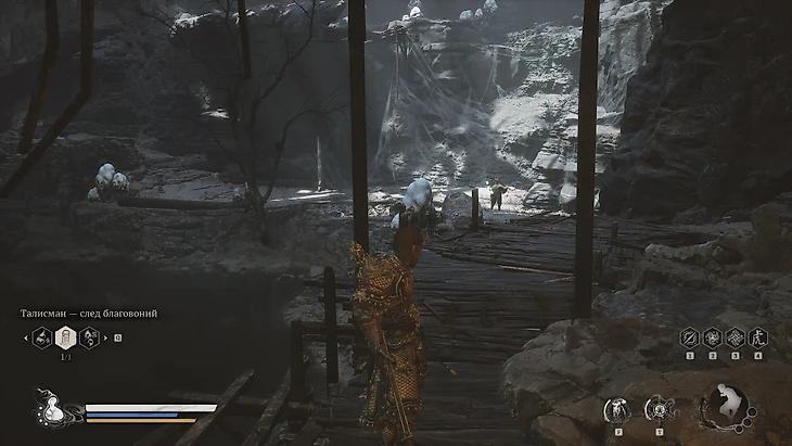 Стойка Прокола поможет справиться с парочкой коконов в начале, но долго эта стратегия не продержится. К тому же, почти нереально отличить настоящих врагов от обычных коконов. Но у нас есть для вас один хитрый трюк, который поможет обвести врагов вокруг пальца и перебраться на другую сторону без падений – Облачный Шаг. Используйте его в начале веревочного моста, а затем несмотря в след убегающему времени мчите что есть сил до конца моста. И даже не думайте вертеть посохом, если в вас полетят стрелы – это верный способ случайно сверзиться с моста.