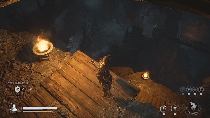 К счастью, разработчики позаботились о нас и разместили неподалеку жаровню у выступа. Если посмотреть вниз, то можно заметить место, чтобы спрыгнуть к двум мостам, которые мы видели в начале Нижней ямы. Так что смело прыгайте – это вернет вас на главный путь.