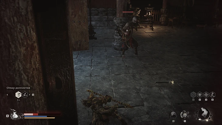 Вход охраняют три монаха, внутри здания засады нет. Не споткнитесь о порог и попробуйте их выманить для простоты, чтобы не вести бой с тремя в закрытом пространстве.
