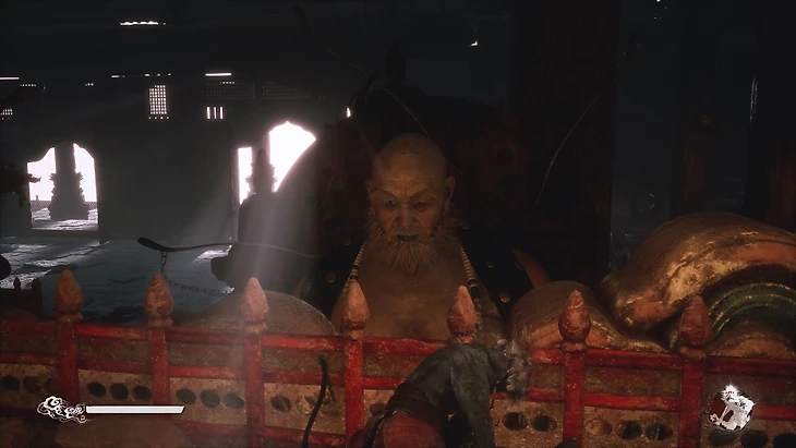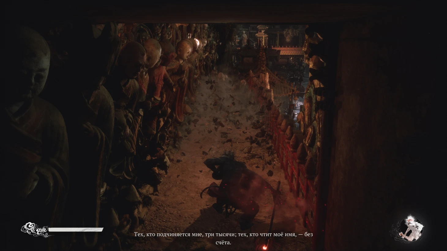 На этой лестнице, если вы брали квест песца, то используйте Кисть Снежного Лиса из инвентаря, чтобы превратиться в Лиса и войти внутрь для кат-сцены (если превратитесь тут, то сможете поговорить с ним, но превращение рядом с монахом сразу запустит бой без сцены). Квест не исчезнет после финальной битвы с боссом в этой локации, так что можете вернуться позднее.
