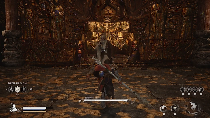 В финальном поединке вы будете в форме Вождя обезьян недолго, поэтому обрушьте как можно больше атак. У Желтобрового есть новые коварные движения, например, золотая защита. Ваши атаки будут отскакивать, а он продолжит атаковать. Используйте тяжелые атаки и расходники для фокусировки, чтобы разбить золотую форму. После 2-3 тяжелых ударов защита разобьется, и Желтобровый будет оглушен. Используйте лучшую Атаку Духа и сильнейшие удары.