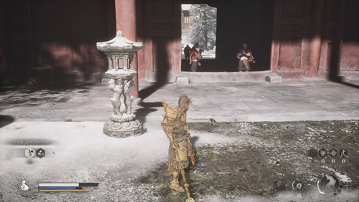 Перед алтарем у открытых ворот молятся Держатели Цензоров, но можно исследовать дальний угол, найти Волка-Стража у дерева и зеленый Огонек на вершине снежного сугроба. На левой стороне в храме продолжится квест лиса, мы еще к нему вернемся. Можно просто сходить за сунудком.