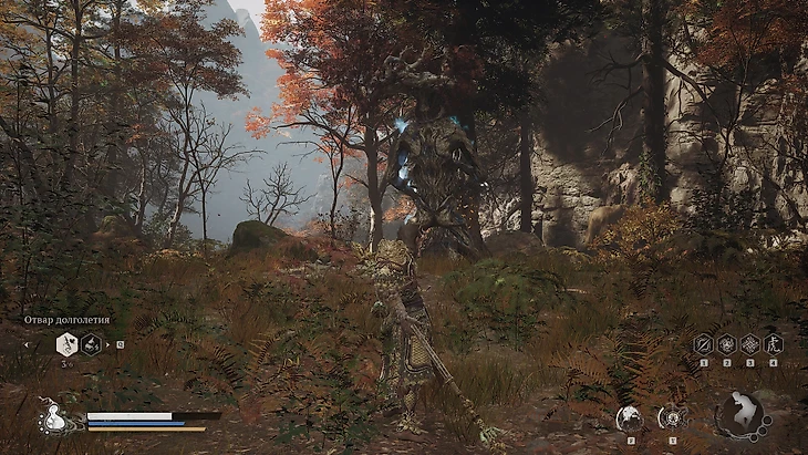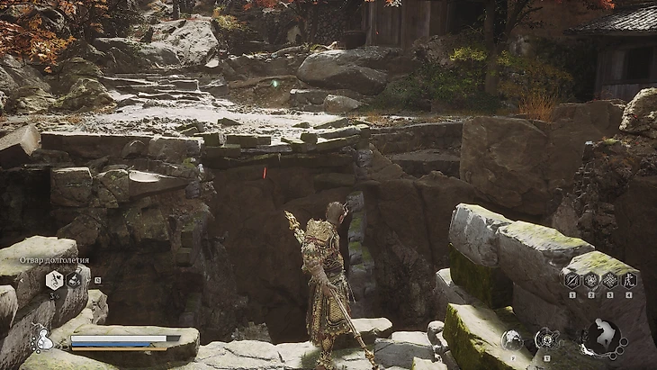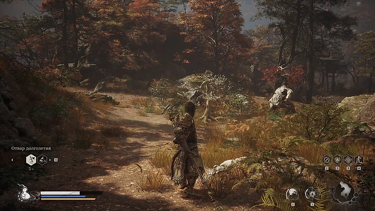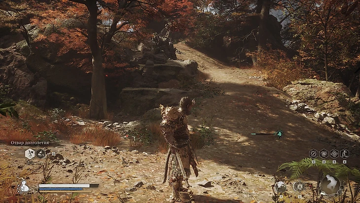 Попробуйте сначала устранить этого врага. Вы найдете извилистую тропу к вершине, через упавший ствол дерева к высокой точке, где рядом с бревном находится сундук с артефактом Золотое Солнце Ворона (усиленный при сочетании с Нефритовым Лунным Кроликом).