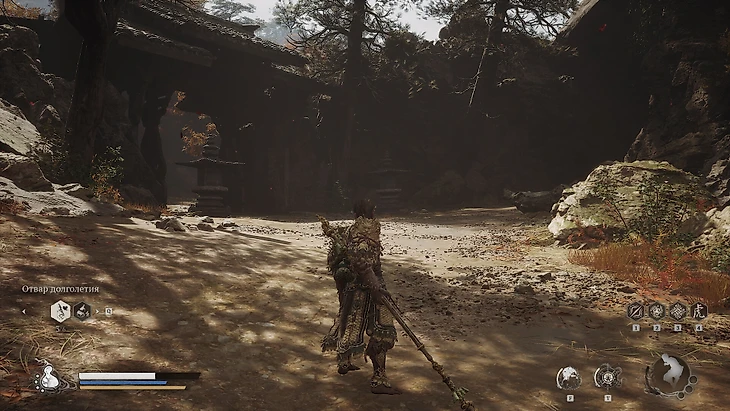 Поднимаясь по каменистой тропе, вы выйдете на обширную открытую площадку. Здесь, у края обрыва, притаилось небольшое строение. На его крыше вы заметите огромного яогуая, который лениво развалился и что-то бормочет себе под нос. Когда вы приблизитесь, он грубо посоветует вам убираться и не мешать ему наслаждаться выпивкой. Если вы жаждете сражения, просто разбейте один из горшков на земле – и яогуай мигом спрыгнет вниз, готовый к схватке. Его неуклюжие движения выдают опьянение, но не стоит недооценивать этого противника. Несмотря на нетрезвое состояние, он остается грозным соперником, способным нанести серьезный урон неподготовленному путнику.