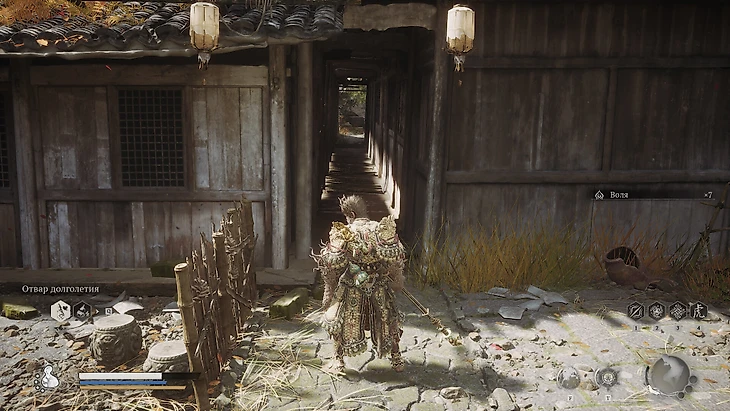 За стеной ров с Даосом перед хижиной справа и заросшей тропой слева. Осмотрите хижины справа: узкий мостик с зелеными светляками ведет к зданию с сундуком и тропой к другому концу деревни. Вернитесь через мост и следуйте по заросшей тропе до моста.