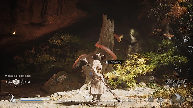 Этот будет сложнее убить из-за усиленного духа. Используйте мощные удары и духов, не забывая о призываемых клонах. Когда он наконец падет, получаете дух Зеленого Сияния, который лечит вместо атаки. Также осмотрите дерево, где медитировал зеленолист. Там обвита ароматная лоза Луоцзя, которую можно собрать.