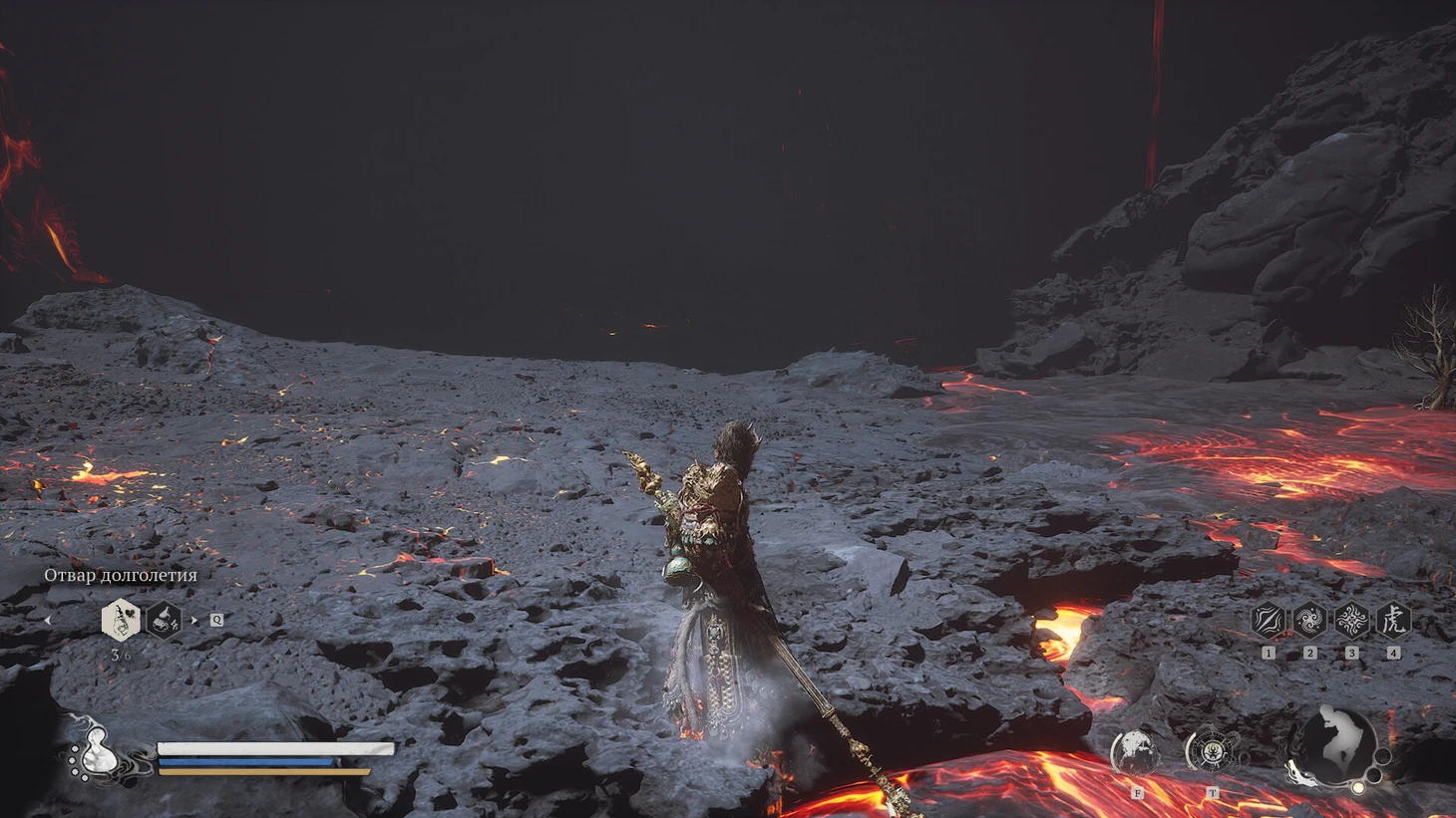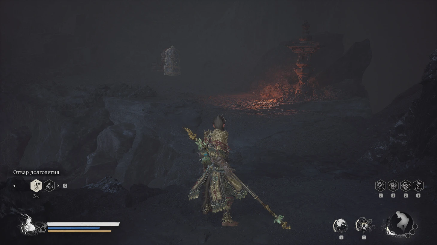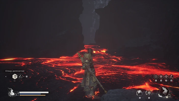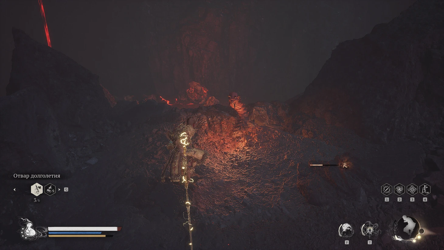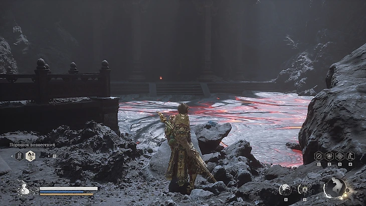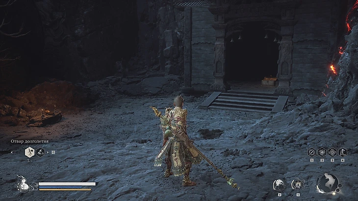 Сразу за святилищем располагается небольшая зона для изучения. Подходя к Святилищу Хранителя, вы заметите золотистый контейнер на бревне позади него. Подойдите и заберите Небесную пилюлю Тайи. Напротив, контейнера, внутри маленькой постройки, находится сундук с сокровищами. Откройте его, чтобы получить Кровь Железного Быка и горсть золотых монет. Вернитесь обратно к лестнице. Прежде чем подняться по ступеням, обратите внимание на потоки лавы по обеим сторонам.