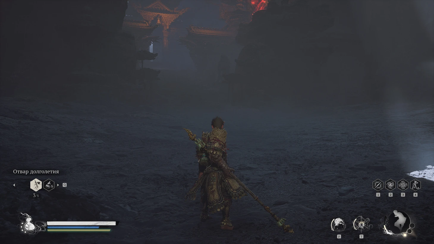 Направьтесь влево и разберитесь со Стражем. Откройте охраняемый им сундук, добыв Тонкую Золотую Нить и Кровь Железного Быка. Затем двигайтесь в противоположную сторону, пройдите под мостом и вернитесь вправо к первой лестнице. Победите охранника перед подъемом. Следуйте по лестницам, после второго пролета поверните направо и пересеките мост. Встретите стража-быка с двумя посохами и двух Мастеров Огненного Носорога. Пройдите мост и поднимитесь по небольшой лестнице в направлении гигантов. Справа вы столкнетесь с Бычьим Губернатором. Хотя лучше разобраться с ним сейчас, не спешите сворачивать вправо.
