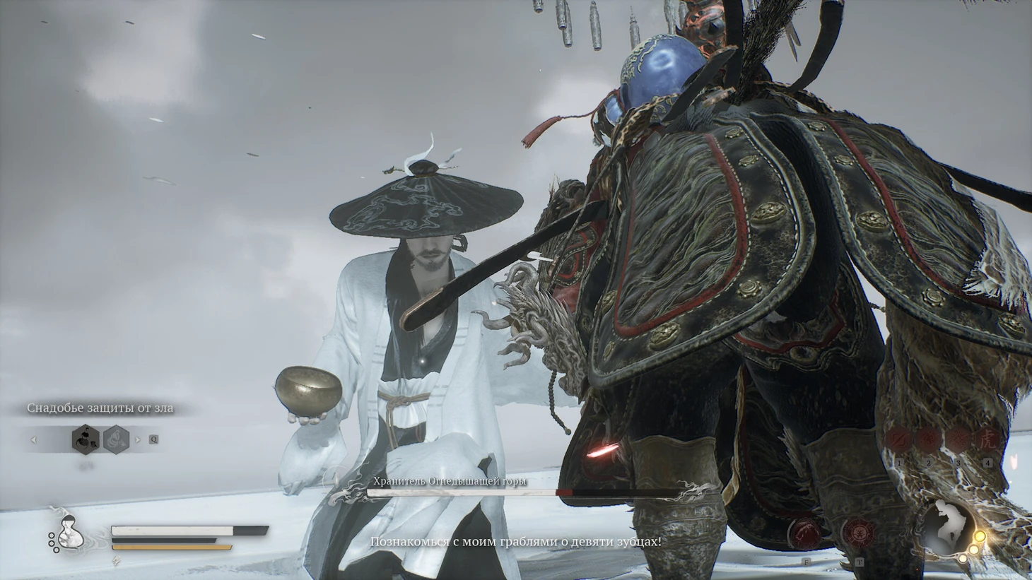 Хранитель Огнедышащей горы перенесет вас в монохромную иллюзию, где использует силу инь-ян. Чжу Бацзе поможет вначале. Бой состоит из двух этапов. На первом этапе атакуйте врага агрессивно, пока он на земле. Уклоняйтесь от белых снарядов. При 60-70% здоровья противник призовет нежить, используя черно-белые сферы.