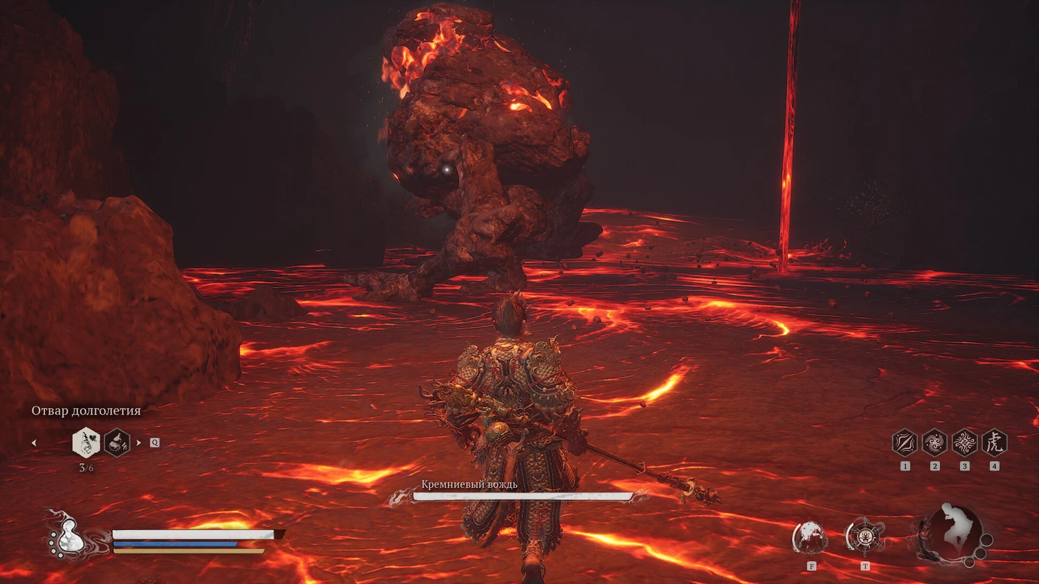 У босса три уязвимые зоны: туловище и обе руки. Сосредоточьтесь на руках – их можно сломать, что сильно ослабит противника. Направьте комбо-атаки и мощные удары на конечности, стремясь быстро вывести их из строя. Это значительно пошатнет устойчивость Вождя Кремней. После победы подберите выпавший Дух Вождя. Не забудьте также собрать Огненный Финик с дерева справа от лавового потока, стекающего с потолка.