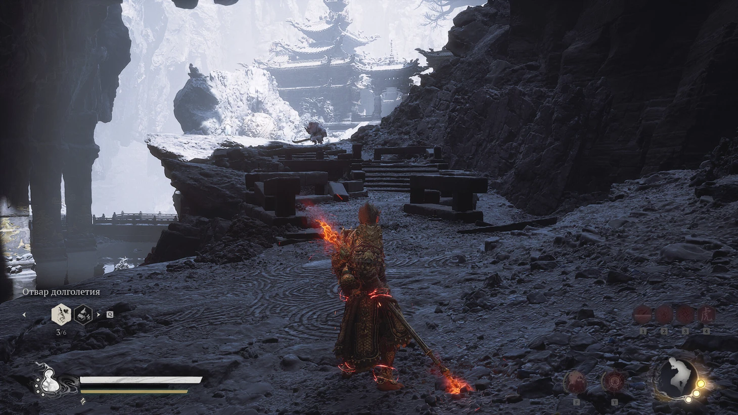Выберите левую тропу. Заметите лестницу с Мастером Огненного Носорога наверху и небольшое святилище с горящим пламенем внутри. Сначала одолейте Мастера на лестнице, затем направьтесь к храму. Внутри обнаружите старика, подарившего вам фляжку в начале игры, и винного червя слева. Поговорите со стариком – он посоветует найти хорошую фляжку (если вы еще не улучшили свою до максимума) и предложит разделить с вами напиток.