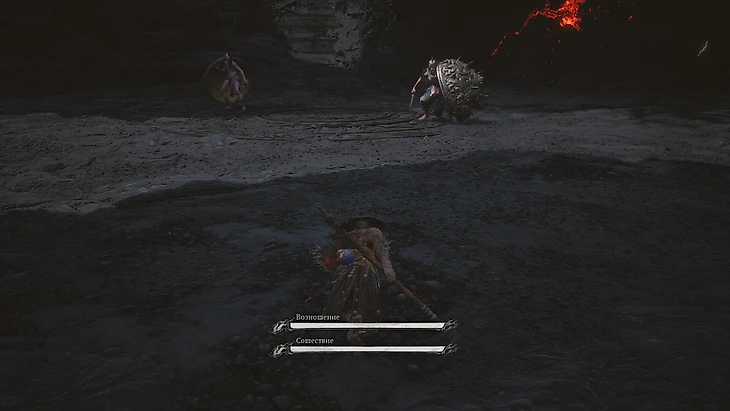 Внутри золотого шара с шипами скрываются два мини-босса. Они используют части шара как щит и вооружены мечами. Бой начинается с Сошествия, который атакует прыжками и перекатами в шаре. Уклоняйтесь и атакуйте, когда он уязвим. После победы над ним появляется Возношение. Она быстро вращается в полушаре и копирует некоторые приемы Сошествия. Избегайте ее атак и наносите удары в подходящие моменты.