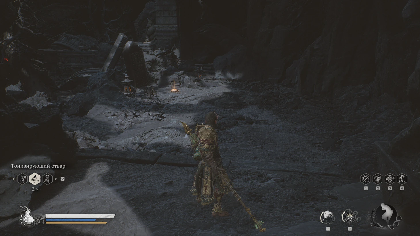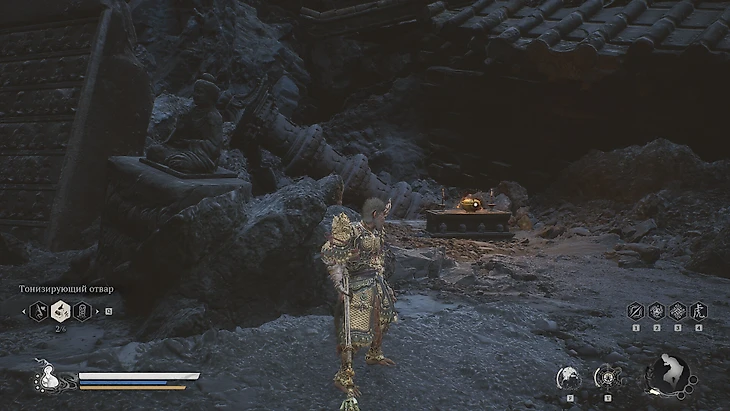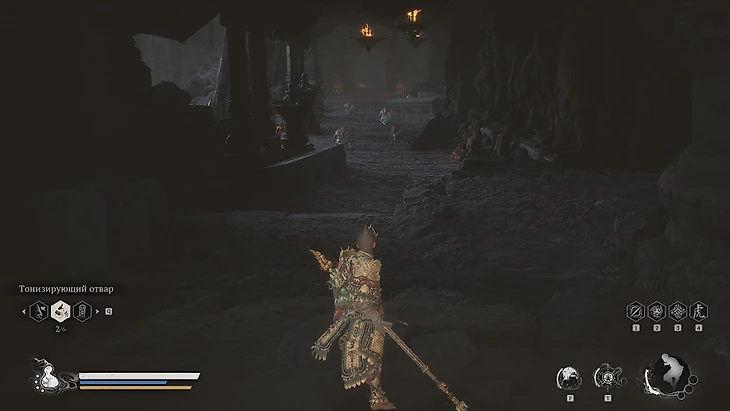 Одолев двойного босса, поднимитесь по лестнице. В следующей зоне справа устраните стража-быка и подберите зеленый огонек поблизости. Двигаясь дальше, обратите внимание на небольшую статую Будды слева. За ней скрыта ниша, где находится золотой горшок. Внутри вас ждет ценная находка – девятикратно очищенная небесная пилюля, увеличивающая максимальный запас выносливости.