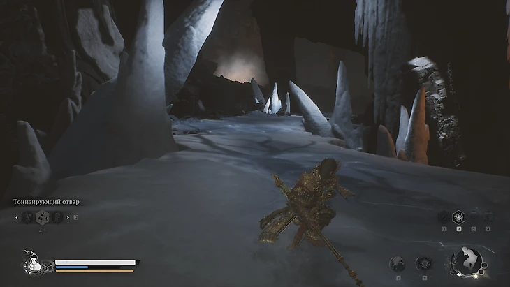 Очистив локацию, пройдите через дверь и следуйте извилистой тропе. Слева заметите зеленый огонек, справа – двух стражей-быков. Подберите Огонек и спуститесь по ледяной дорожке слева. Внизу двигайтесь прямо, затем обогните камень справа, минуя статую. Спрыгнув, найдете сундук с Золотым Ядром Дерева и Кровью Железного Быка.