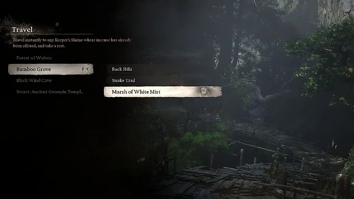 Но как же пользоваться Ароматной лозой и наложить дополнительные эффекты на лечащую бутылку? Для этого вам нужно найти обезьяну Шэнь. Этот персонаж является ключевым для улучшения некоторых предметов и снаряжения главного героя. Найти Шэня очень легко – он обитает рядом с алтарем «Бамбуковая роща: Топи белого тумана» на Горе Черного Ветра. После того, как вы доберетесь до него один раз, у вас откроется функция «Перемещение» до чекпоинта, а уже оттуда можно за несколько секунд добраться до Шэня.
