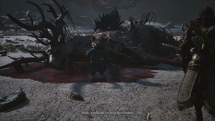 Лучше отойти подальше от вихрей и дождаться приближения оленя. Так удобнее наблюдать за его прыжками и подготовкой к удару. При приземлении уклонитесь от ледяной волны и атакуйте. Когда бой кажется завершенным, начинается вторая фаза. Олень истекает кровью, образуя ядовитые лужи.