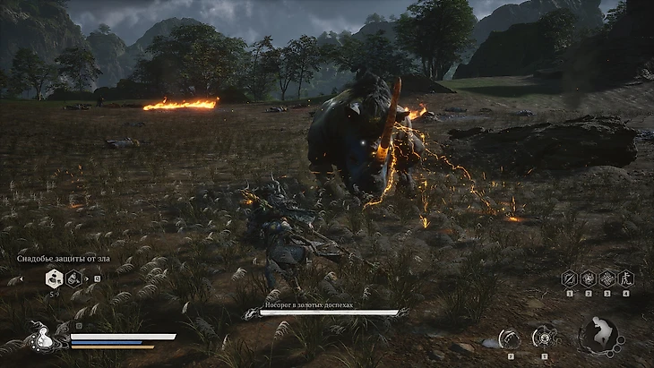 Атаковать Носорога эффективнее всего по рогу. Если промахнулись, бейте сзади, вызывая его гнев. Копите заряд и атакуйте, когда противник замедляется. Ключевой момент – появление искр вокруг рога. При вспышках молний готовьтесь к регенерации рога. Используйте камни как укрытие, но будьте готовы уворачиваться. Близкие атаки Носорога – шанс для накопления фокуса, если эта способность разблокирована.