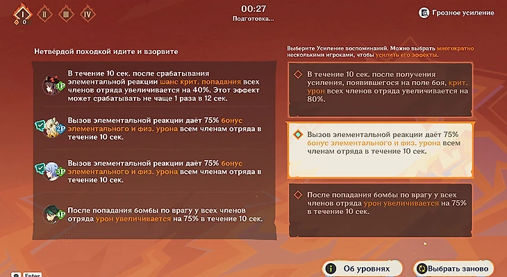 Желательно взять героя, способного хилить и наносить урон, чтобы не надеяться на команду. К таким относятся Невиллет, Ризли, Шилонен-дпс, Кокоми, Барбара, С2 Фурина и другие. Смотрите за героями ваших союзников: если никто не взял хилера, лучше взять его самостоятельно. Всего четыре уровня испытания: боевые и на сбор монет. За 4 героя разных стихий дают дополнительный бафф.