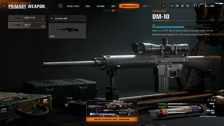 DM-10. Полуавтоматическая DMR, обладающая наивысшей стабильностью и мощностью в своем классе. DM-10 идеально подходит для марксманов, которые ценят высокую точность и надежность на средних и дальних дистанциях. Открывается на 43 уровне и станет незаменимым оружием для опытных стрелков, готовых к любым боевым вызовам.