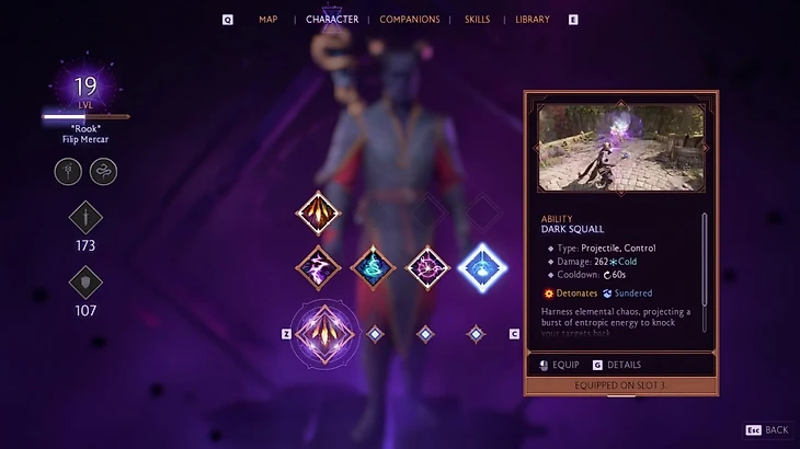 Система совершенствования навыков главного героя отличается более комплексным подходом по сравнению с его соратниками. Каждое умение классифицируется по одной или двум категориям, таким как «Контроль», «Снаряд», «Взрыв», «Удар», «Длительность» или «Область действия». Улучшения в древе талантов влияют на все способности, относящиеся к указанному типу.