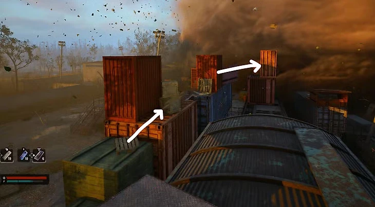 Преодолейте ящики и совершите прыжок на соседний контейнер. Это начало небольшой полосы препятствий, ведущей к центру аномалии. Далее перелезьте через контейнер и спрыгните на два других, между которыми есть узкий проход. Преодолев эти контейнеры, вам предстоит перепрыгнуть через два разрыва, чтобы достичь контейнера справа.