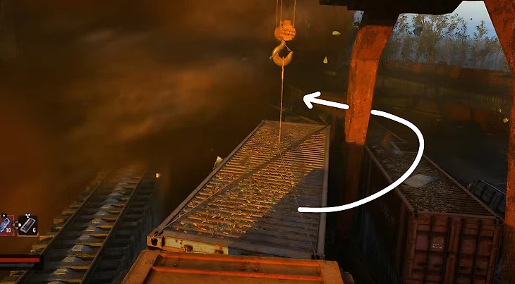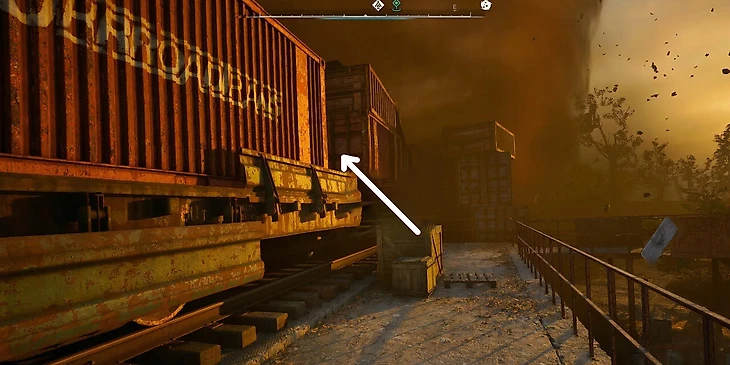 Доберитесь до судоверфи в районе Янова и войдите в зону аномальной активности торнадо. Дождитесь, пока воронка смерча минует ржавую платформу. Как только путь освободится, стремительно поднимитесь на платформу и отыщите штабель ящиков возле железнодорожного вагона.