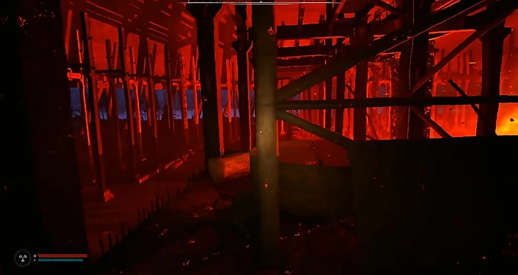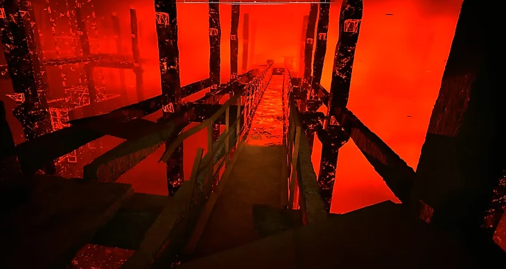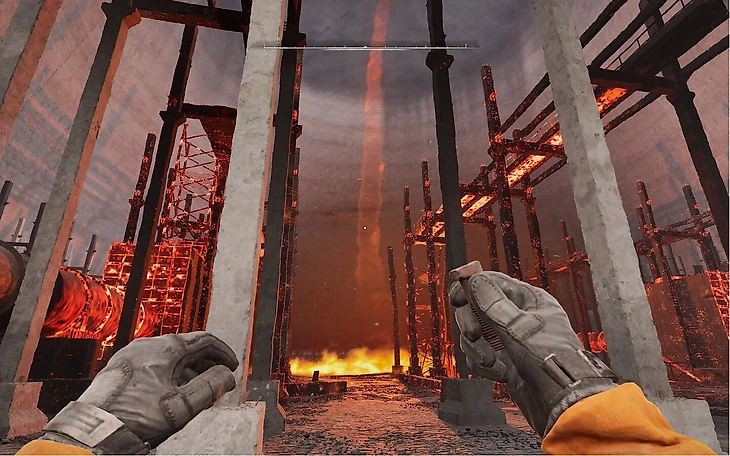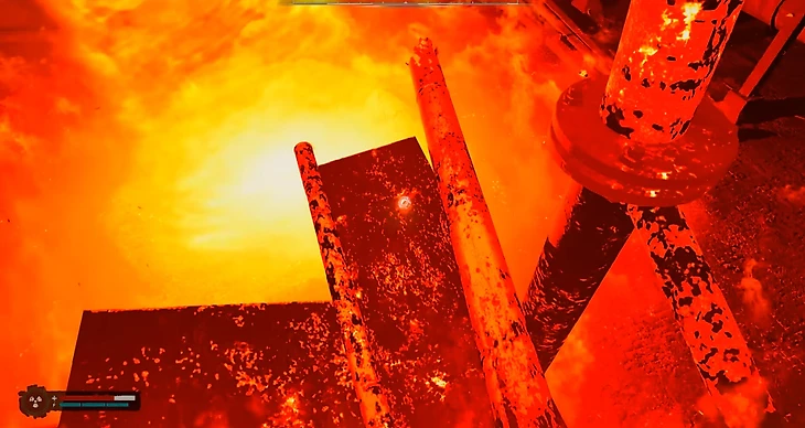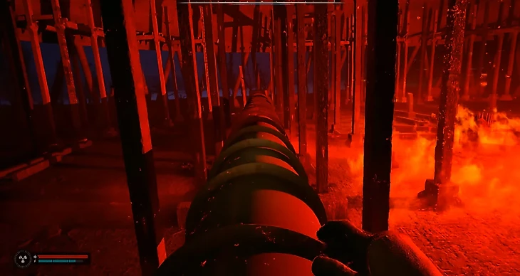 Вот безопасный план действий: для начала обогните зону слева от входа до наклонной бетонной колонны у трубы. Дождитесь нового цикла аномалии для старта с полным 40-секундным запасом времени. Взберитесь по колонне на лестницу, бегите по трубе до следующей лестницы.