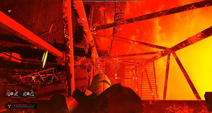 Когда объекты остынут, бегите к строительным лесам, забирайтесь на них и берите артефакт. Он отмечен квадратом на скриншоте и находится прямо рядом с огненным центром аномалии.