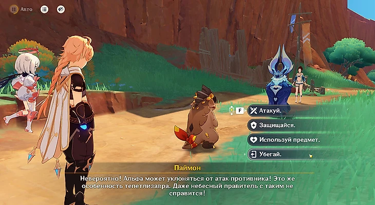В мини-игре нужно победить соперника, используя разные действия. Выбор тут не влияет – можно атаковать или защищаться несколько раз, пока у Паймон не кончатся фразы. В итоге ваша команда победит.