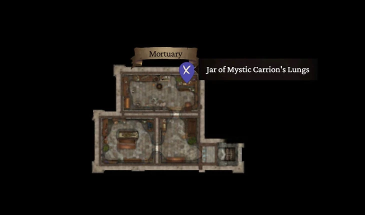 Чтобы найти легкие Падальщика, отправляйтесь в Морг. Он находится под Кладбищем в северо-восточной части Нижнего города. Найдите Гробницу Дуринболдов, рядом увидите горизонтальные двери [КС 10]. Они ведут в подвал. Спуститесь туда и пройдите в северную комнату Морга. На столе вы обнаружите искомые легкие.