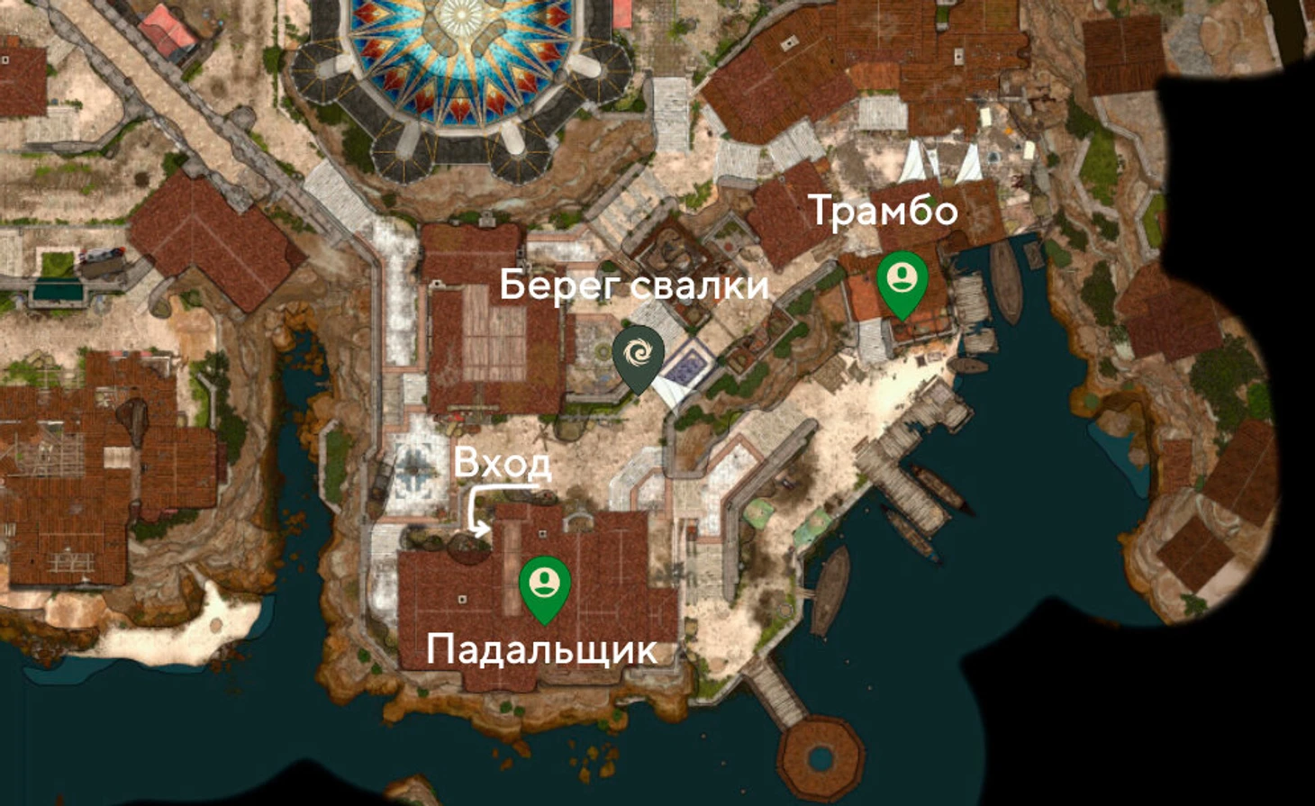 Для настоящего расследования попробуйте выяснить, кому адресовано послание Трамбо. Вспомните: в Нижнем городе вы могли видеть странных, болезненных бродяг. Пообщавшись с ними, вы поймете, что беглые слуги Падальщика обосновались недалеко от дома хозяина, в пустующем здании. На карте выше можно увидеть дорогу к его дому.