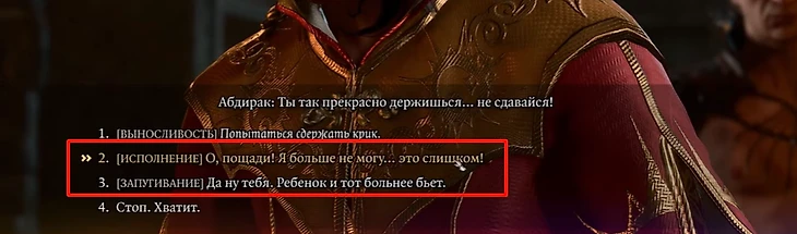 После того, как вы примите предложение Абдирака, подойдите к стенке лицом. Он ударит вас дубиной, после чего нужно будет выбрать один из вариантов. Здесь важно не выбирать вариант с пометкой «ВЫНОСЛИВОСТЬ». Не пытайтесь сдерживать крик или показывать, что вам не больно. Также важно держать уровень общего здоровья выше 40%.